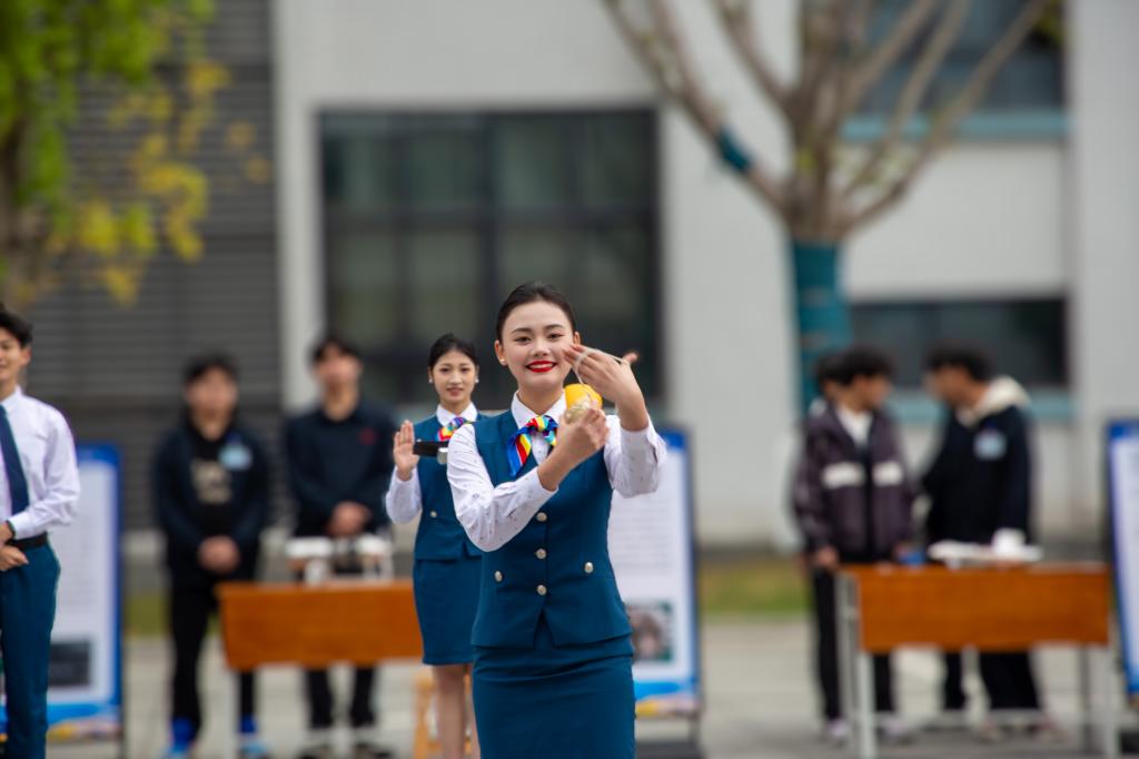 开幕仪式后的专业技能展示环节亮点纷呈,以硬核实力向空军76华诞致敬。空中乘务专业学生呈现的《守正创新・礼耀云端》,生动展示了标准民航服务礼仪;《筑牢民航安全防线的双重守护》则精彩演绎了地面安检与机上应急核心技能。飞行器设计与制作、航空零部件制造等学生创新实践作品同步展示,充分展现了航院学子在航空领域的实践能力与创新思维,引得与会人员驻足喝彩。