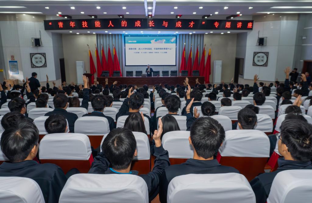 黄建康在航空发动机装配与研究领域深耕十九载,曾荣获科学技术一等奖、劳动模范、装配技能大师等集团级和所级荣誉20余项,是业内公认的技术领军者。讲座中,他以“从校园迷茫到职场攻坚”为主线,用亲身经历为同学们解答“青春之惑”。在校期间,他将“看不懂装配图”的焦虑转化为动力,刻苦钻研,啃完了30余本专业书籍;走上工作岗位后,他从“拧好每一颗螺栓”做起,累计参与了20余个型号整机及传动主减速器的装配与分解任务。在一次次的实践锤炼中,他完成了从“职场新人”到“技术带头人”的华丽蜕变。谈及“成长与成才”,黄建康总结出两句话:“成长是顺其自然的积累,成才是刻意为之的蜕变”。他提醒同学们,航空发动机装配精度要求极高,0.01毫米的误差都不容出现,唯有通过“刻意练习”,才能在平凡中追求卓越。他鼓励大家将迷茫转化为探索的动力,将困难视为成长的阶梯,在课堂学习与实训锻炼中提前实现从“学生”到“准员工”再到“工匠”的身份跨越。