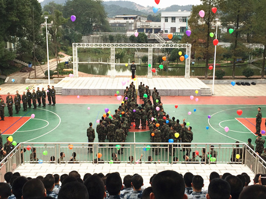 学员组成我院校徽方阵队放飞气球