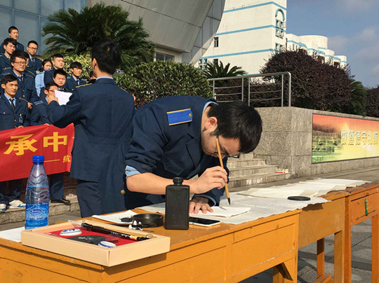 数百名机制学院学子齐聚体育馆前,手持横幅、同诵文学经典“少年中国说”。“天地苍苍,乾坤茫茫,中华少年,顶天立地当自强…”随着朗诵人激昂的声音响起,活动正式开始。全场朗诵声音时而低沉,时而高亢,语速时而缓慢,时而极速,同学们的面容也随着书中情景所变,显然他们已深深地融入“少年中国说”,也正慢慢走近它的意境。另有同学现场书法,挥毫泼墨、一气呵成我院校训“自强不息,止于至善”,至此朗诵声也逐渐消失,活动圆满结束。