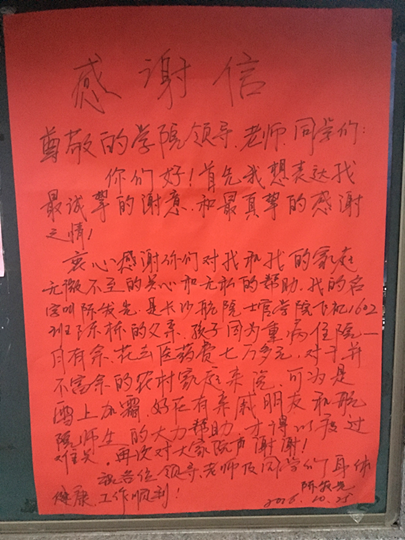 10月27日上午,我院士官学院飞机1602班患病同学陈栋的父亲送来了感谢信,对为陈栋同学在患病期间提供帮助的所有老师和同学们表示深深感谢之情,士官学院院长胡德军、党总支副书记司马吉凯、学生助理任俊桦、余翠军老师接待了家长一行。