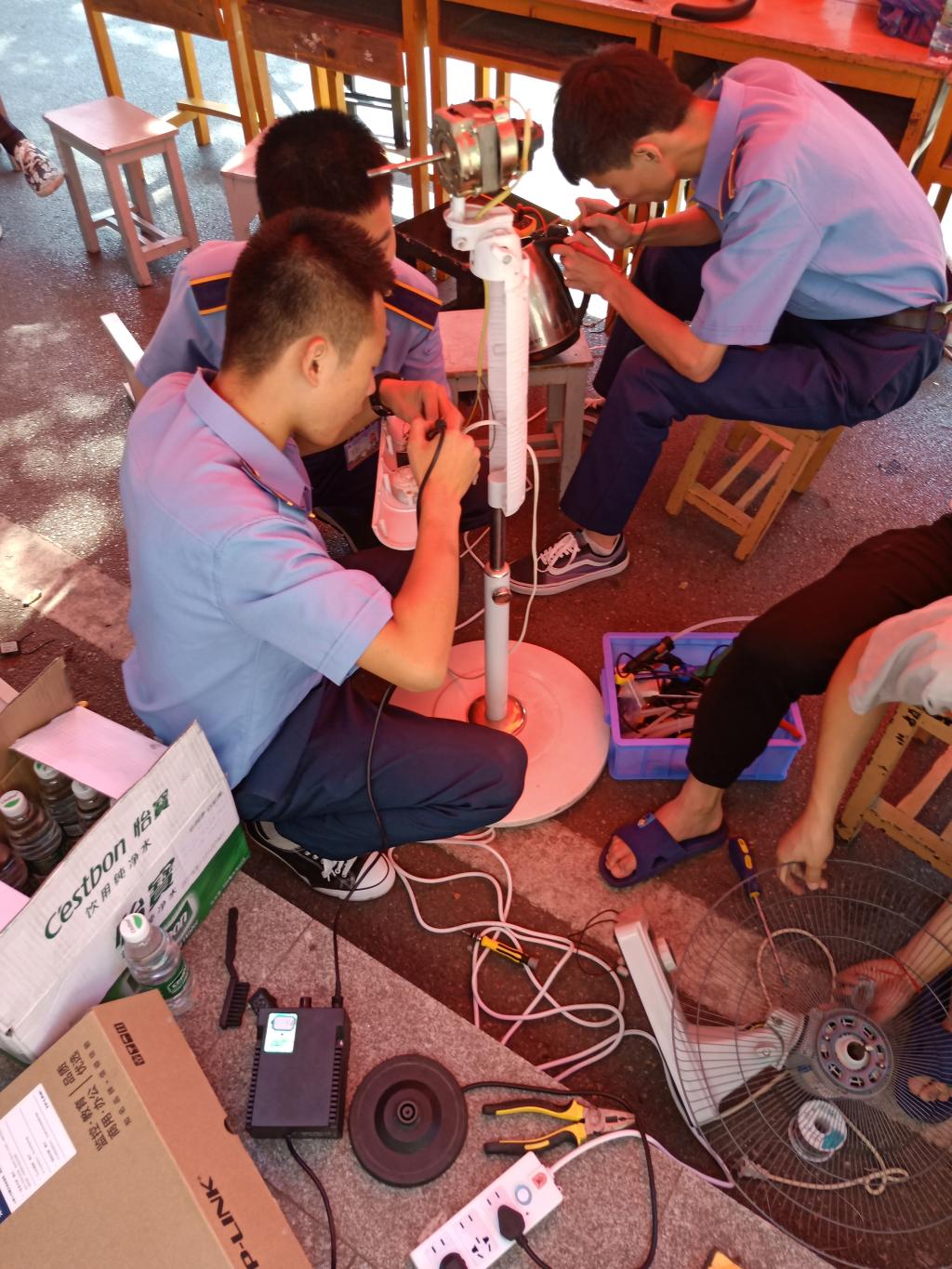 活动正式开展前一天,电子协会的同学组成宣传小分队,从学院北门新田小学至新田村沿路进行入户宣传,争取将受众面积做到最大化,为周边居民提供便利服务。22日上午八时,义务维修正式开始之前,我们在南门所设置的维修服务点已经有不少居民前来排队咨询,他们将自家需要维修的电器拿出来,与同学们进行交流协商,告知需要维修的部分,同学们热情的为居民们进行解答。九时许,我们的准备工作就绪,场面一度火爆,居民们将自家的电器如数家珍的拿出来,霎时间摆满了电水壶、风扇、电吹风、电磁炉等电器。在这次活动中,电子学院学生秉承“不怕苦、不怕累”的精神,当天在现场共计修理成功大小电器50件,顺利完成了此次义务活动,更有一些电器因元器件暂时不足登记在册进行后期修理。